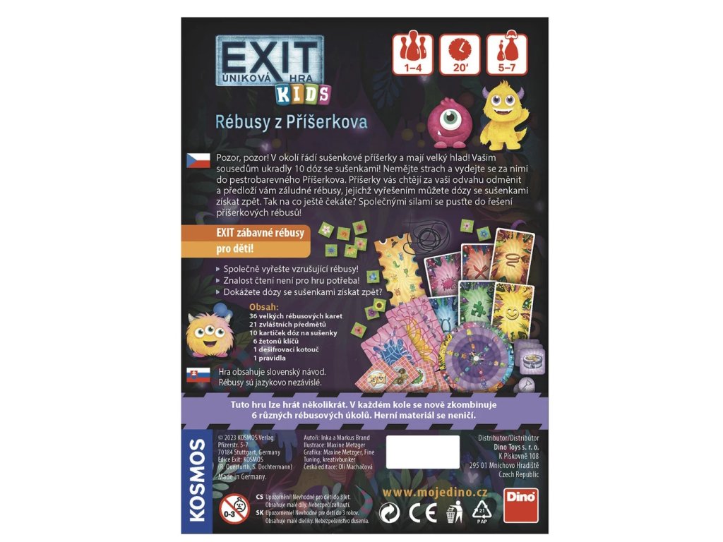 Úniková hra EXIT je originální rébusová hra pro děti, která je zavede do ilustrované kuchyně, kde řádí příšerky. Děti musí vyřešit různé úkoly a hádanky, aby zachránily dózy se sušenkami a další poklady. Hra je určena pro domácí zábavu a nevyžaduje znalost čtení, takže ji zvládnou i mladší hráči.