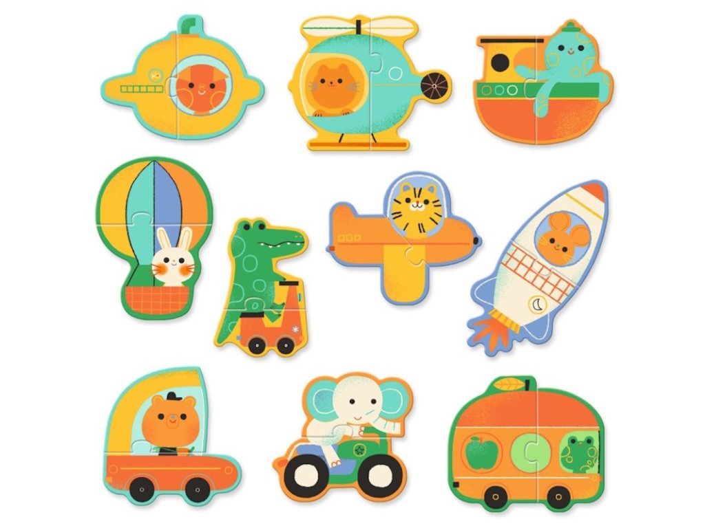 Vzdělávací puzzle na téma dopravních prostředků pro nejmenší děti od 2 let. Dítě skládá 2 dílky vozidla, které řídí roztomilé zvířátko.