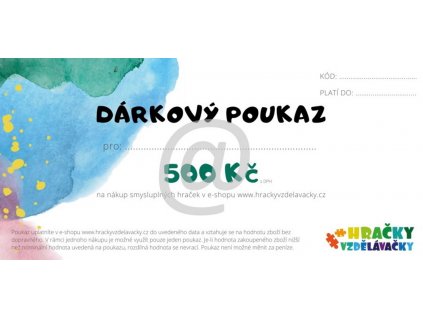 Podmínky použití poukazu: Poukaz není vázán na jméno, pouze na uvedený kód, který pro uplatnění zadáte v košíku u objednávky. Poukaz uplatníte v e-shopu www.hrackyvzdelavacky.cz do uvedeného data (6 měsíců od koupě) a vztahuje se na hodnotu zboží bez dopravného. V rámci jednoho nákupu je možné využít pouze jeden poukaz. Je-li hodnota zakoupeného zboží nižší než nominální hodnota uvedená na poukazu, rozdílná hodnota se nevrací. Pokud nákup hodnotu poukazu převýší, rozdíl doplatíte formou platby dle vašeho výběru. Poukaz není možné měnit za peníze.