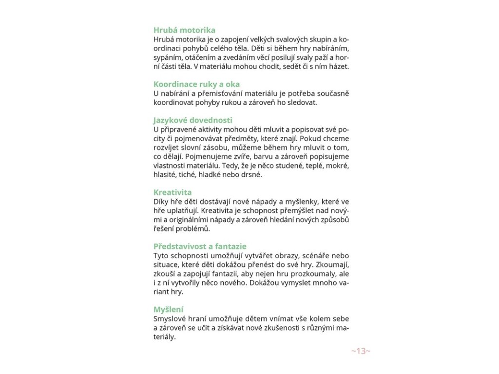 V knize se dozvíte, co smyslové hraní je a co vše přináší. Zjistíte, že smyslové hraní můžete dětem nabízet z toho, co máte už teď doma. Najdete v ní jednoduché návody a tipy na přípravu smyslových materiálů a aktivit pro děti. Kniha je doplněna fotografiemi, díky kterým budete vědět, jak má takový materiál vypadat. Můžete se inspirovat pomůckami a zjistíte, že naprosto obyčejně vypadající aktivita vaše dítě zabaví na velmi dlouho.