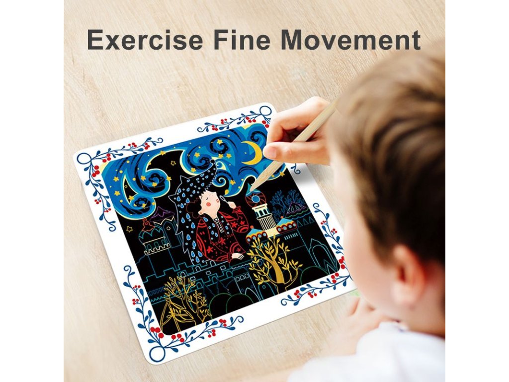 Až se s touto technikou seznámíte, vyrobte si vyškrabávací obrázek sami! Budete potřebovat: čtvrtku polokartonu, voskovky, tuš, vyškrabávací pero z této sady či podobný předmět. Postup: Čtvrtku celou vybarvěte tlustou vrstvou voskovky, můžete použit různé barvy a kreslit jen pruhy barvy, či ornamenty. Pozor! Veškerá plocha papíru musí být vybarvený voskovkou, jinak se tuš vsákne do papíru! Takto mastný papír potřete tuší a nechte zaschnout v plnou vrstvu. Poté vemte vyškrabávací pero a vytvořte si obrázek dle vlastní fantazie. Lze si jej předkreslit tužkou.