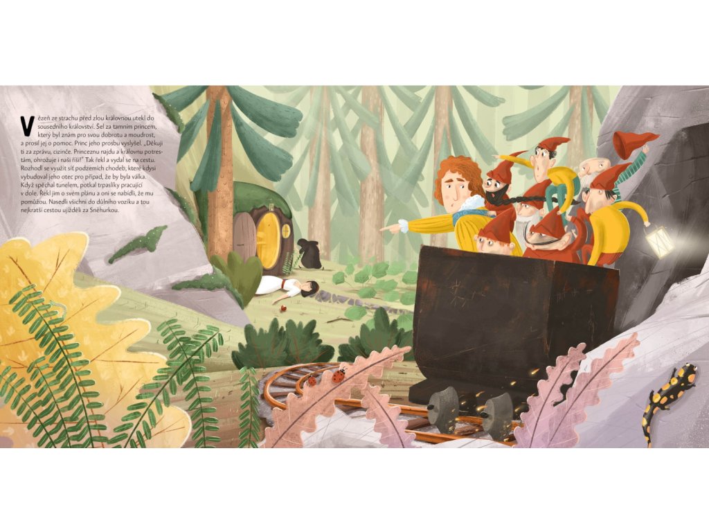 Žila jednou jedna královna a té velice záleželo na tom, jak vypadá. Věřila, že je nejkrásnější ženou na světě, snad s výjimkou její nevlastní dcery Sněhurky. Ta byla opravdu krásná a žárlivá královna se s tím nedokázala smířit, rozhodla se proto Sněhurky zbavit. A jak to s krásnou princeznou a její zlou macechou dopadlo? To se dočtete v pohádkové encyklopedii Objevujeme podzemí se Sněhurkou. Vedle známého pohádkového příběhu se na sedmi rozkládacích a bohatě ilustrovaných mapách dozvíte i o tom, co se v podzemí skrývá, kdo v něm kromě sedmi trpaslíků pracuje, která zvířata tam žijí, ale také o podzemních stavbách a dalších zajímavostech spojených s „říší“ pod povrchem země. Objevujeme podzemí se Sněhurkou je unikátní mix pohádky a encyklopedie, který potěší ale také poučí všechny malé čtenáře a jejich rodiče.
