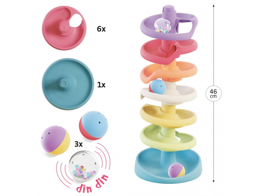 Věž složená z šesti barevných prvků s velkou základnou, aby to vše bylo pevně vyvážené. Barevné kuličky běží po spirálové dráze a poskytují zábavu všem dětem. Jedna z kuliček při pohybu chrastí. Vyrobeno v pastelových barvách a příjemné na dotek. Vhodné pro děti od 1 roku. Vyrobeno ze 100% recyklovaných materiálů v sérii PLAYECO+.