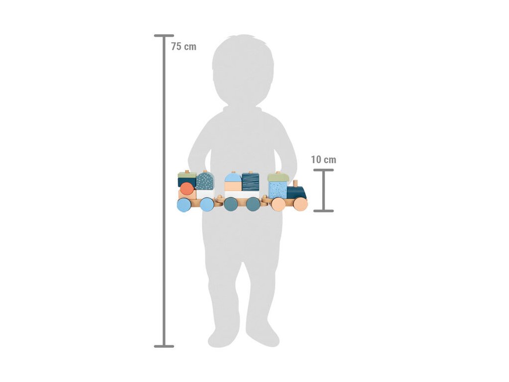 Vláček slouží nejen jako dopravní prostředek, ale i jako zasouvací a stohovací hra, která podporuje koordinaci ruka–oko, logické myšlení a jemnou motoriku. Děti si mohou vagónky a kostky libovolně přestavovat nebo je využít samostatně jako stavební dílky.