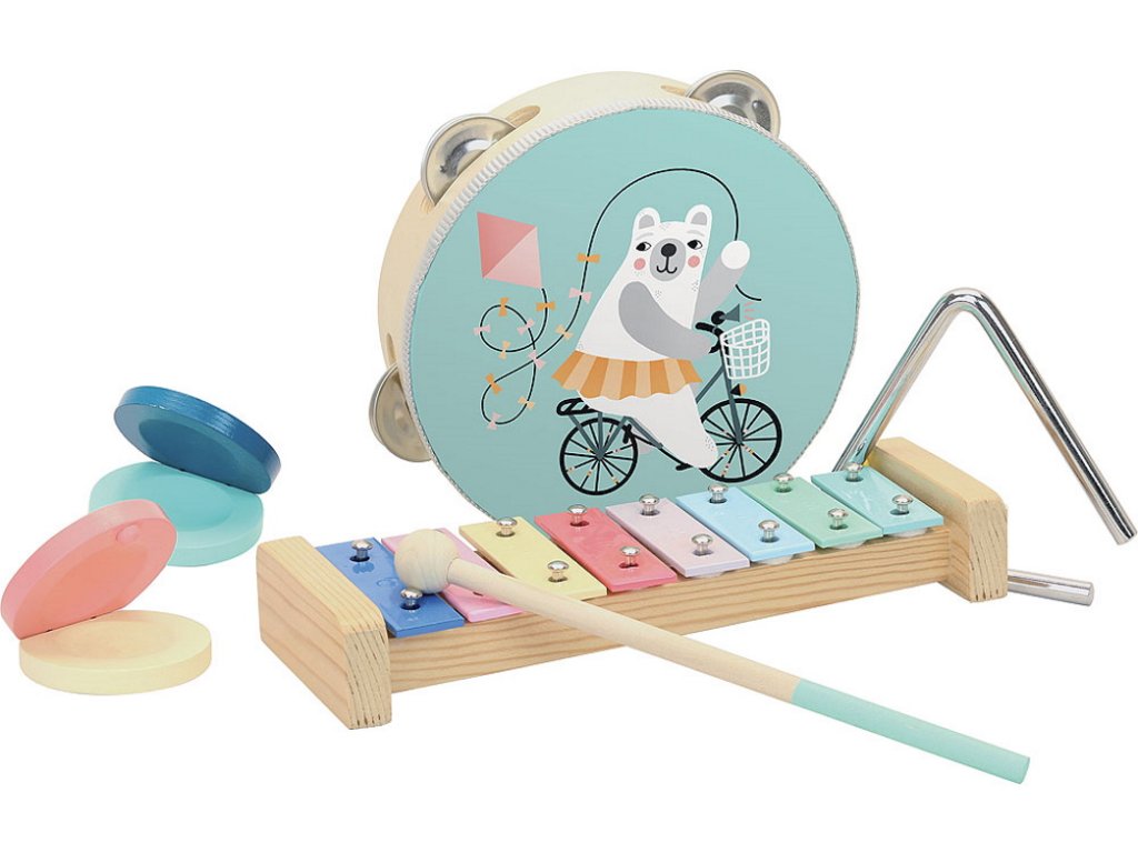 Sada malovaných dřevěných nástrojů s jedinečným designem vede děti jak k lásce k hudbě, tak i ke krásným věcem. Nástroje - tamburína, triangl a 2 kastaněty - jsou plně funkční a mohou poskytovat plnohodnotný doprovod ke zpívání doma či ve školce. Děti se s nástroji učí porozumět a cítit rytmus písní.